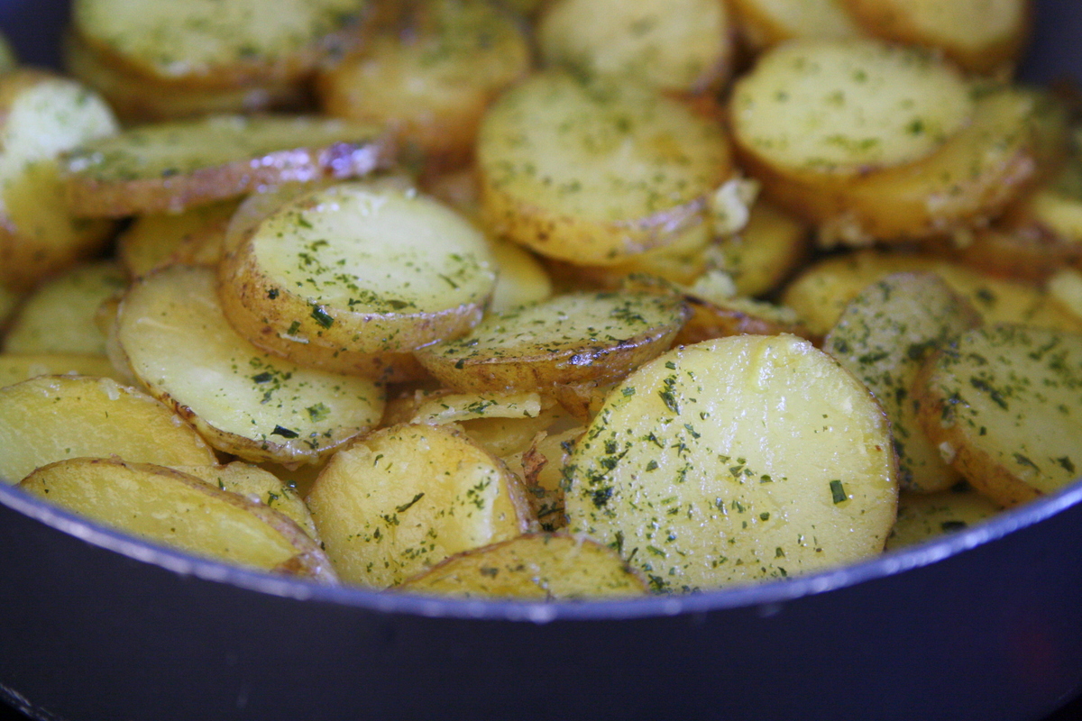 Hetta upp en djup pannan med pressad vitlök och fräs utan att bränna. Lägg ner potatisen och stek på medelsvag värme och vänd om då och då, använd lock för att få jämn värme. Potatisen kommer ta cirka 40- minuter till 1 timme att göra beroende på hur stora bitar du har.