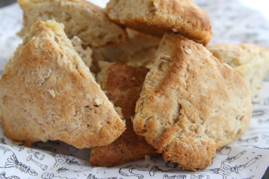 Ställ ugnen på 250 grader. Blanda först de torra ingredienserna i en skål , tärna ner smöret och arbeta ihop till en hyfsat grynig massa, blanda ner mjölken och arbeta till en deg . Dela degen i fyra högar och platta ut dem till runda bröd, skär ett kryss rätt över bröden med en kniv och nagga brödkakorna med en gaffel. Grädda i mitten på ugnen i cirka 10 minuter, eller tills de fått en gyllene färg. Serveras genast