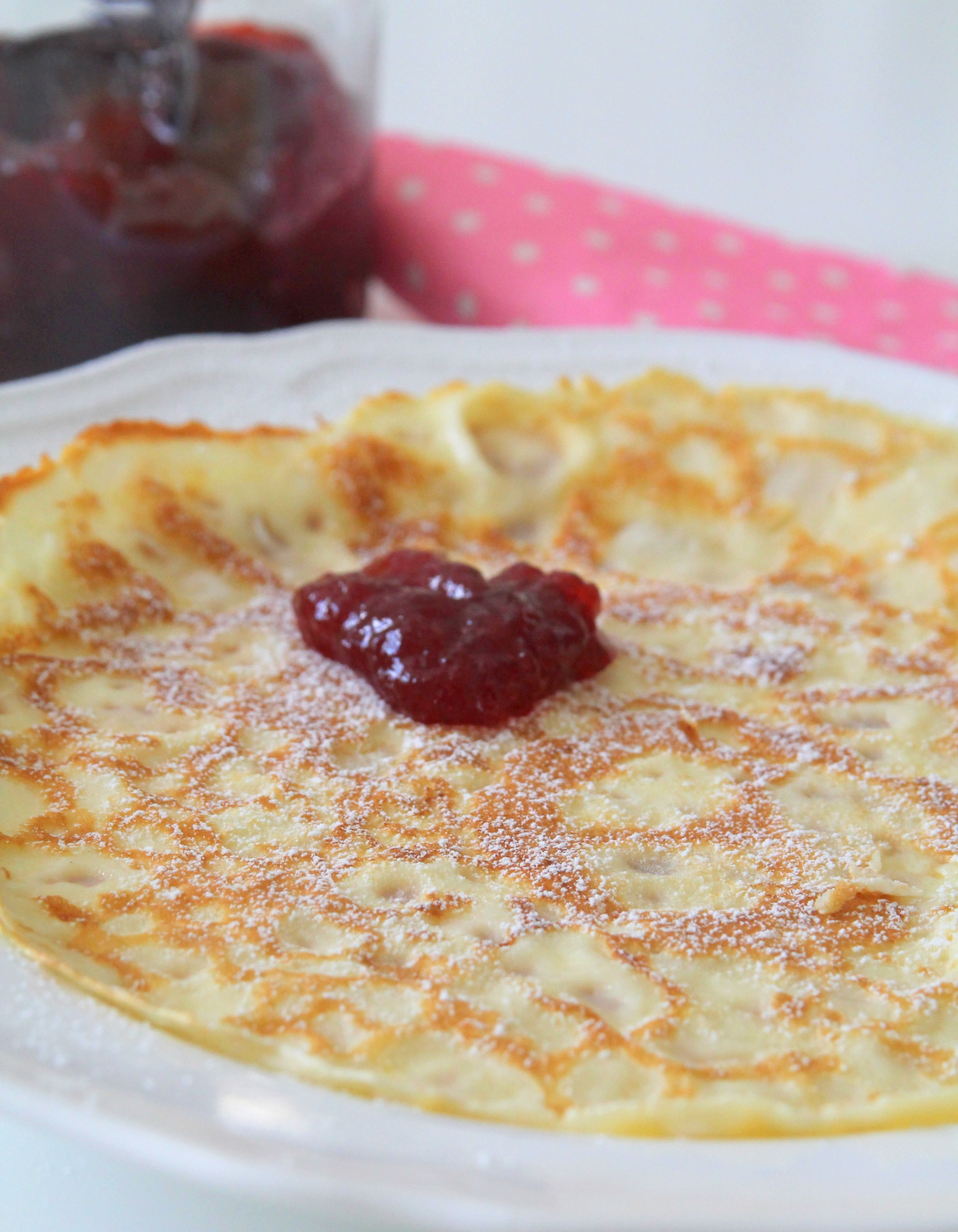 Det heter crepes hos mig, de är sååå tunna att man ser igenom de. Vaniljsocker och nypa strösocker är ett måste i smeten för att få den fina färgen. Basen är självklart Nutell med valfri topping, tex riven kokos, smulad digetsivkex, skivad banan, jordgubbar etc etc… MUMMA!!!
