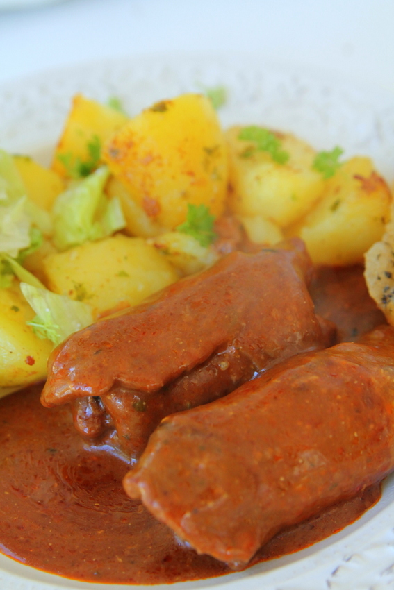 Häll över såsen så att den nästan täcker rulladerna helt och ställ in i mitten av ugnen i cirka 30 minuter. Då och då kan du ösa på såsen lite över lövbiffarna. Potatisen kokade jag och stekte klart i olja och kryddade med nyklippt persilja och flingsalt.