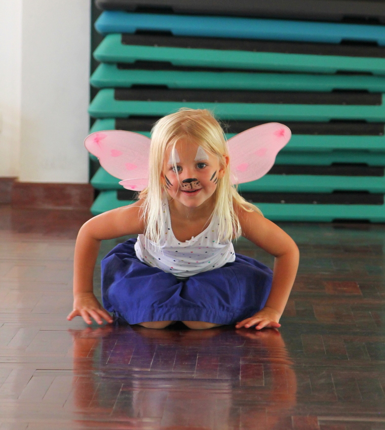 Solen är väldigt stark här, och det är jättepositivt att det finns lite inomhusaktiviteter ibland om dagarna. Här finns miniland , så barnen kan måla t-shirtar , pyssla , skattjakter och även spela teater. Och Nomi har medverkat i sin första teaterföreställning, jag tror att de fick välja lite själva vad den skulle handla om. Nomi valde iallafall att vara katt, med rosa änglavingar.