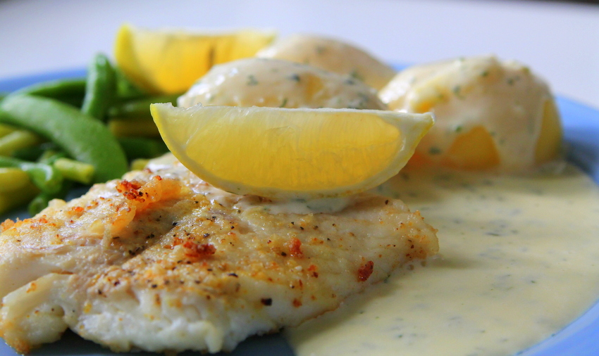 Servera sedan med ärtiga bönor, kokt potatis, och en bit citron.