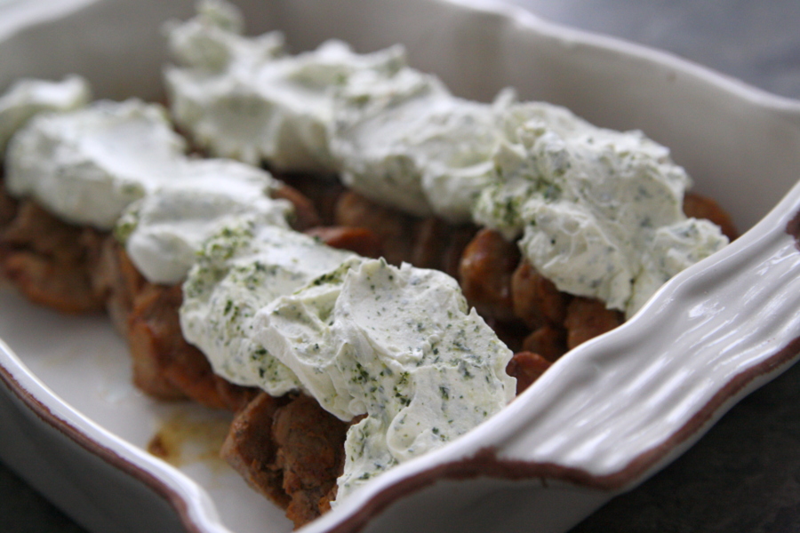 Börja med att blanda ihop philadelphiaosten med örtkryddan. Och ställ kallt under tiden du gör köttet. Skär köttet i lagom stora bitar. Hetta upp en stekpanna med smör och bryn sedan köttet tills det fått fin färg. Krydda med salt & peppar. lägg det färdiga köttet i en ugnsfastform och fördela över osten. Ställ in i mitten av ugnen i 10 – 15 minuter tills osten smält och blivit genom varm. Servera genast med klyftpotatis och en krispig sallad.