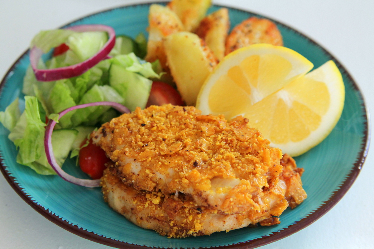Servera sedan de krispiga kycklingbitarna med klyftpotatis och en god sallad.