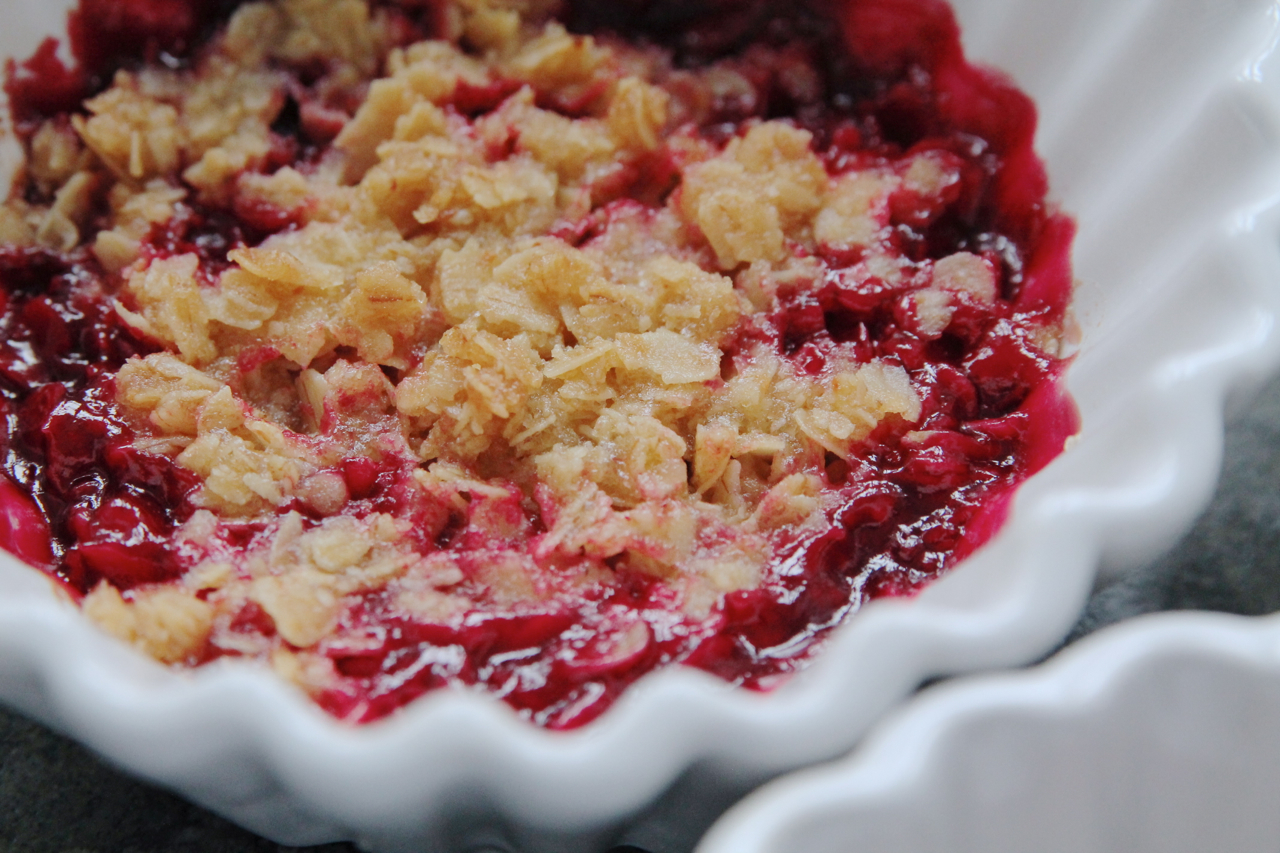 Ställ ugnen på 180-200 grader. När du gör crispet så smälter du smöret i en kastrull, och när det börjar dofta härligt nötigt tar du bort det från plattan. Rör ner havregryn,socker och mjöl och fördela ut över pajerna.