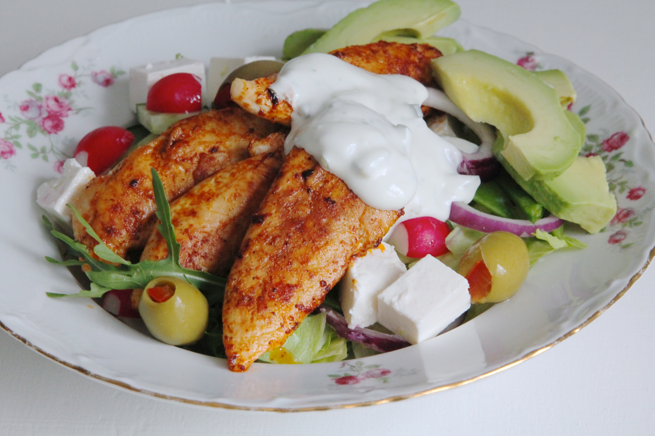 Stek sedan kycklingen med paprikapulver & salt. Skiva upp alla grönsaker och servera med en stor klick tzatziki.