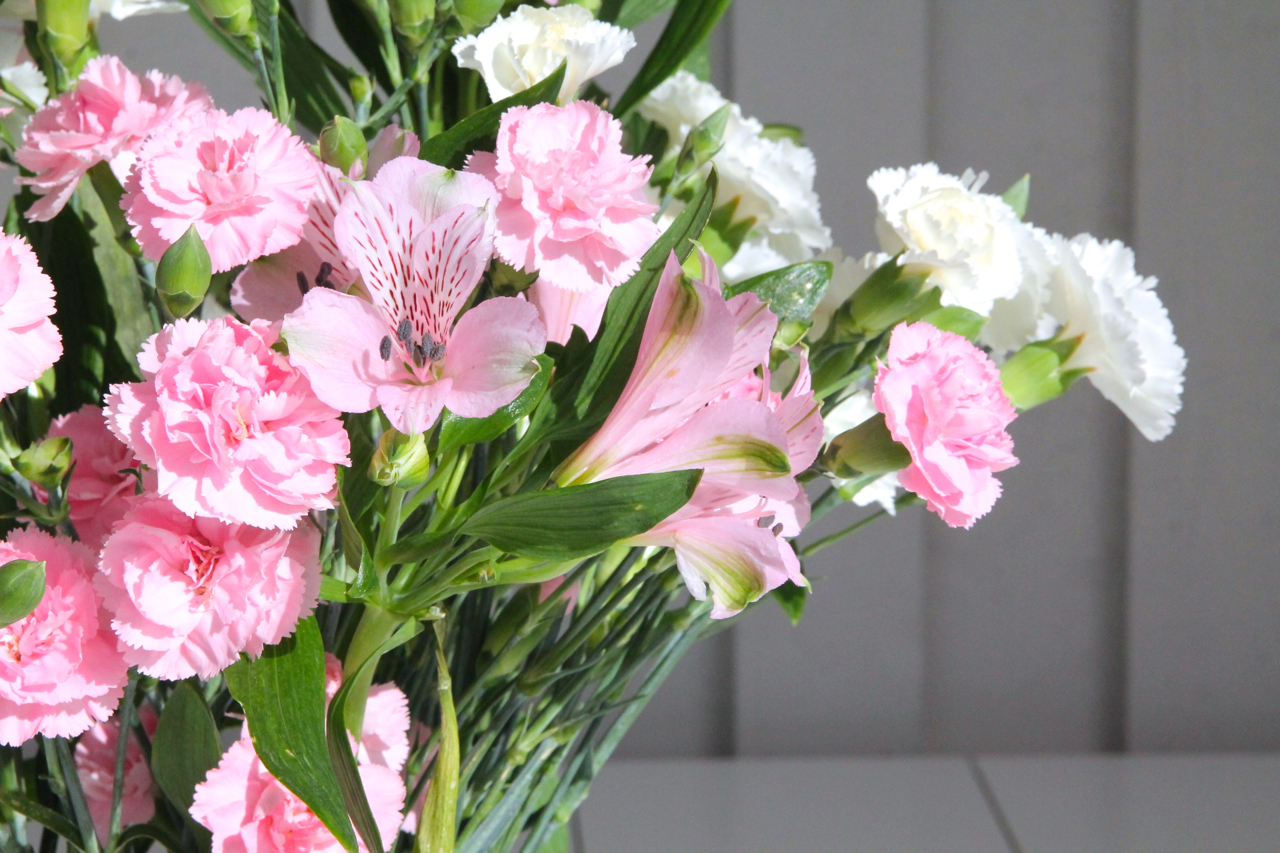 På bordet står rosa / vita blommor som matchar senaste numret av Damernas värld pastelliga omslag.