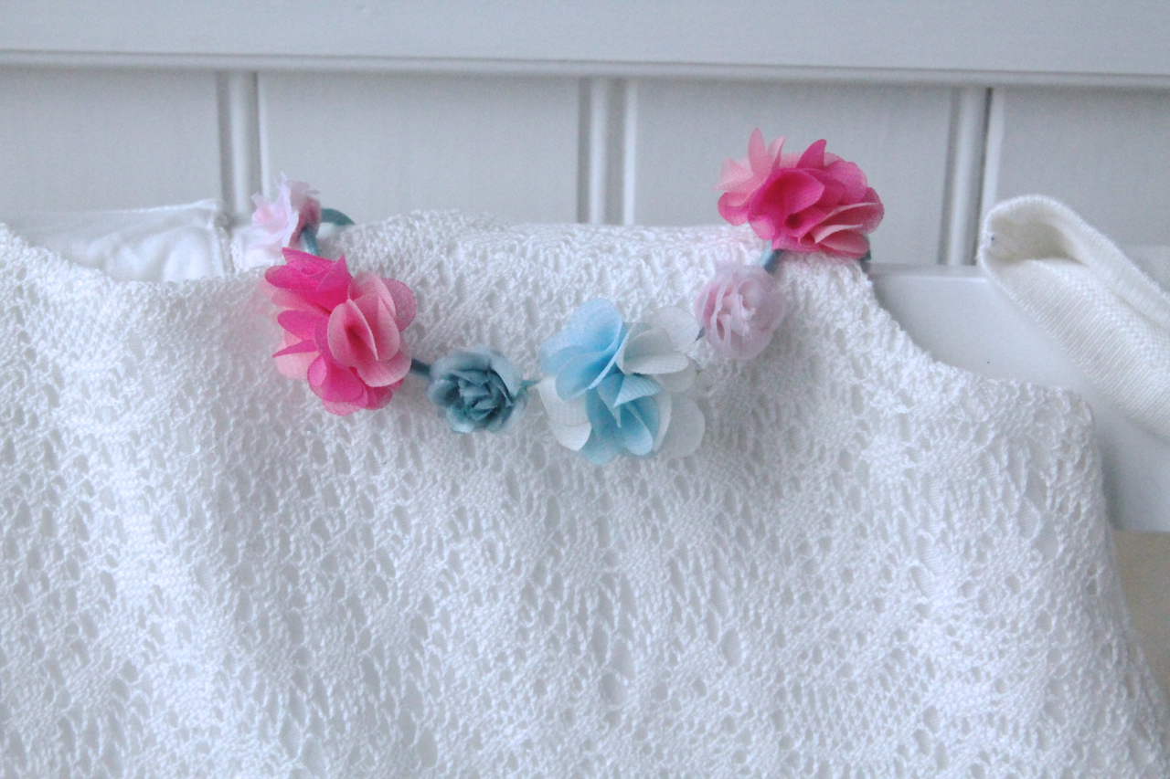Nomi fick en vit klänning med en bolero och ett sött hårband med blommor.