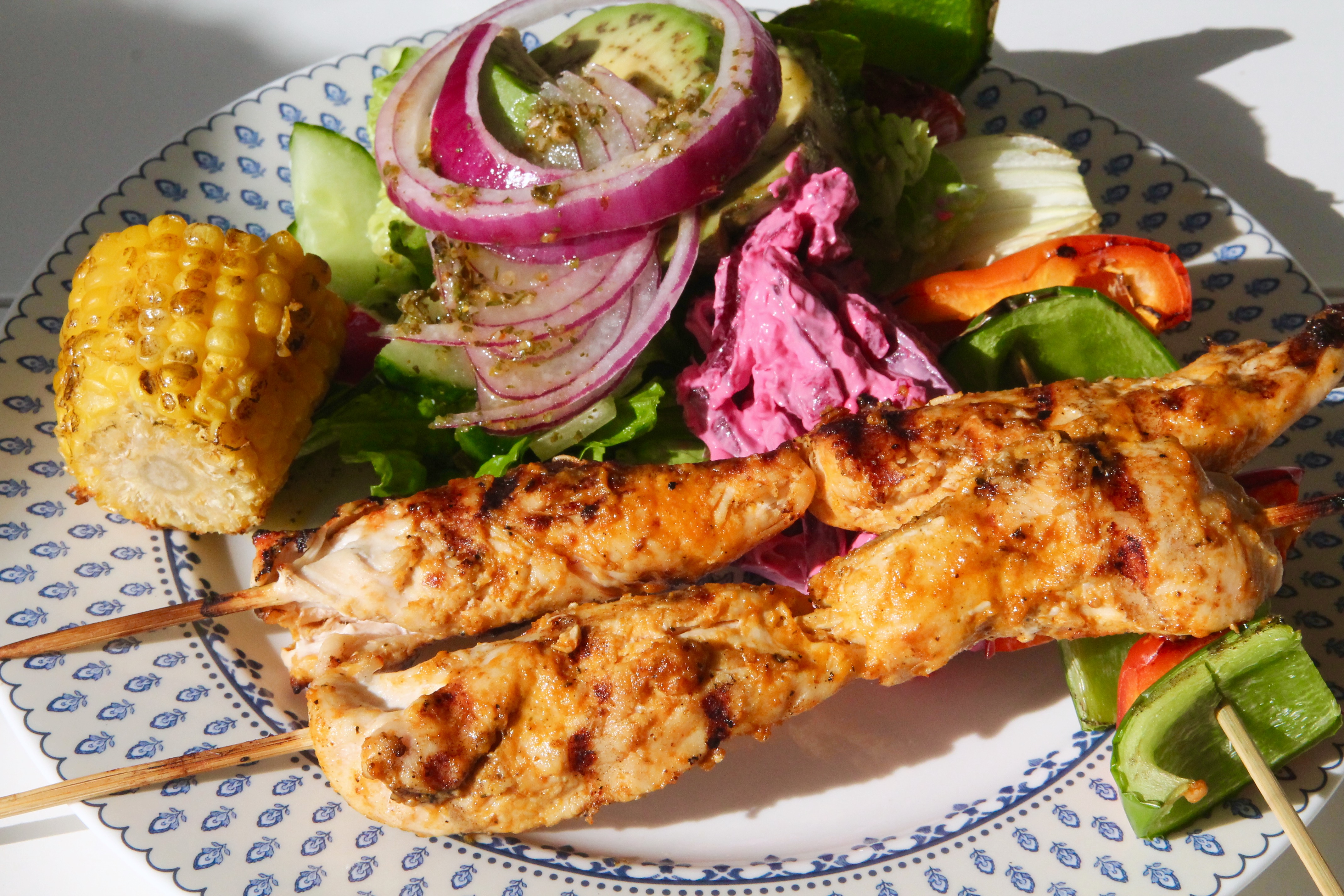 En somrig sallad med grillade kycklingspett, marinerade i detta