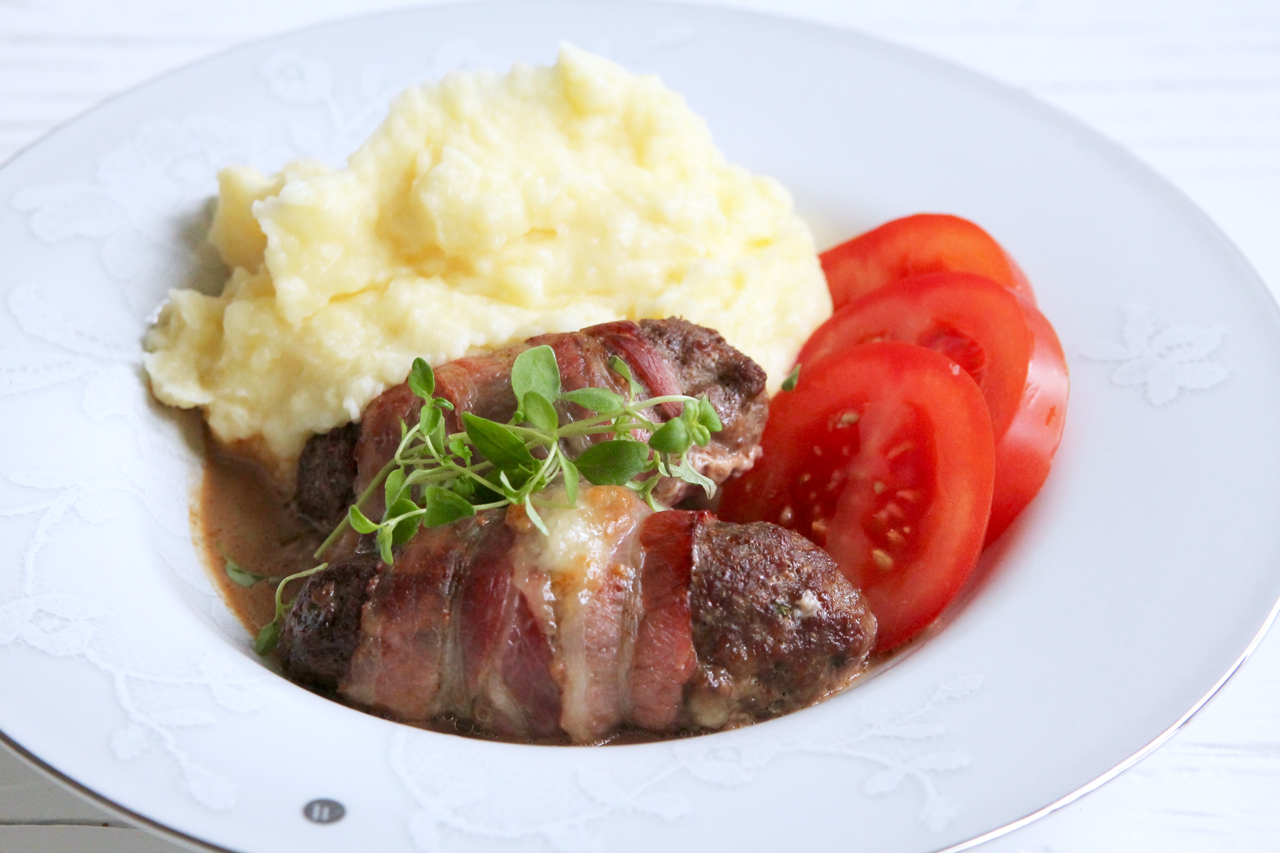 Bacon ger sälta och mozzarellan gör dem saftiga.
