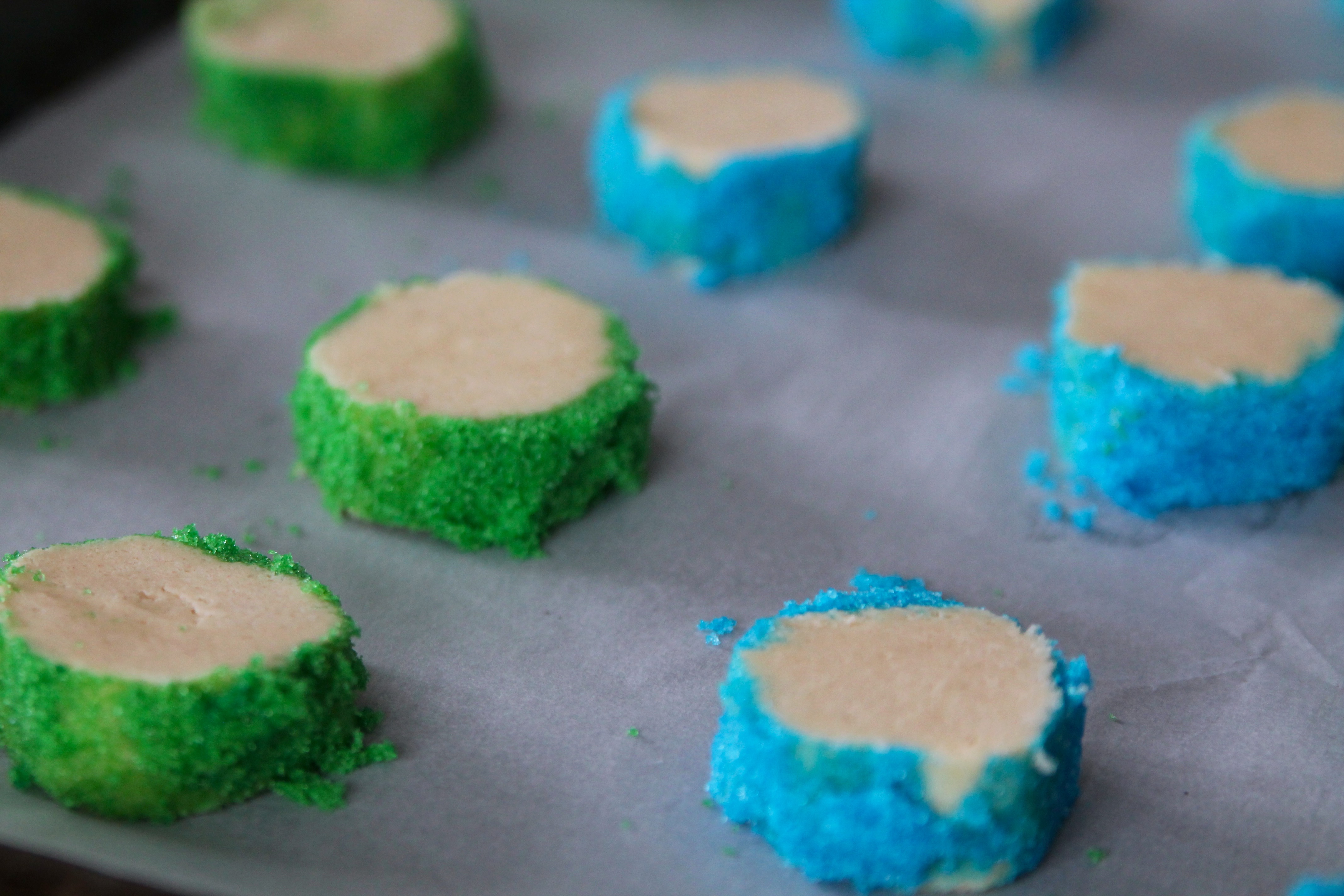 Nyp ihop mördegen och rulla till två längder. Rulla längderna i det färgade sockret,