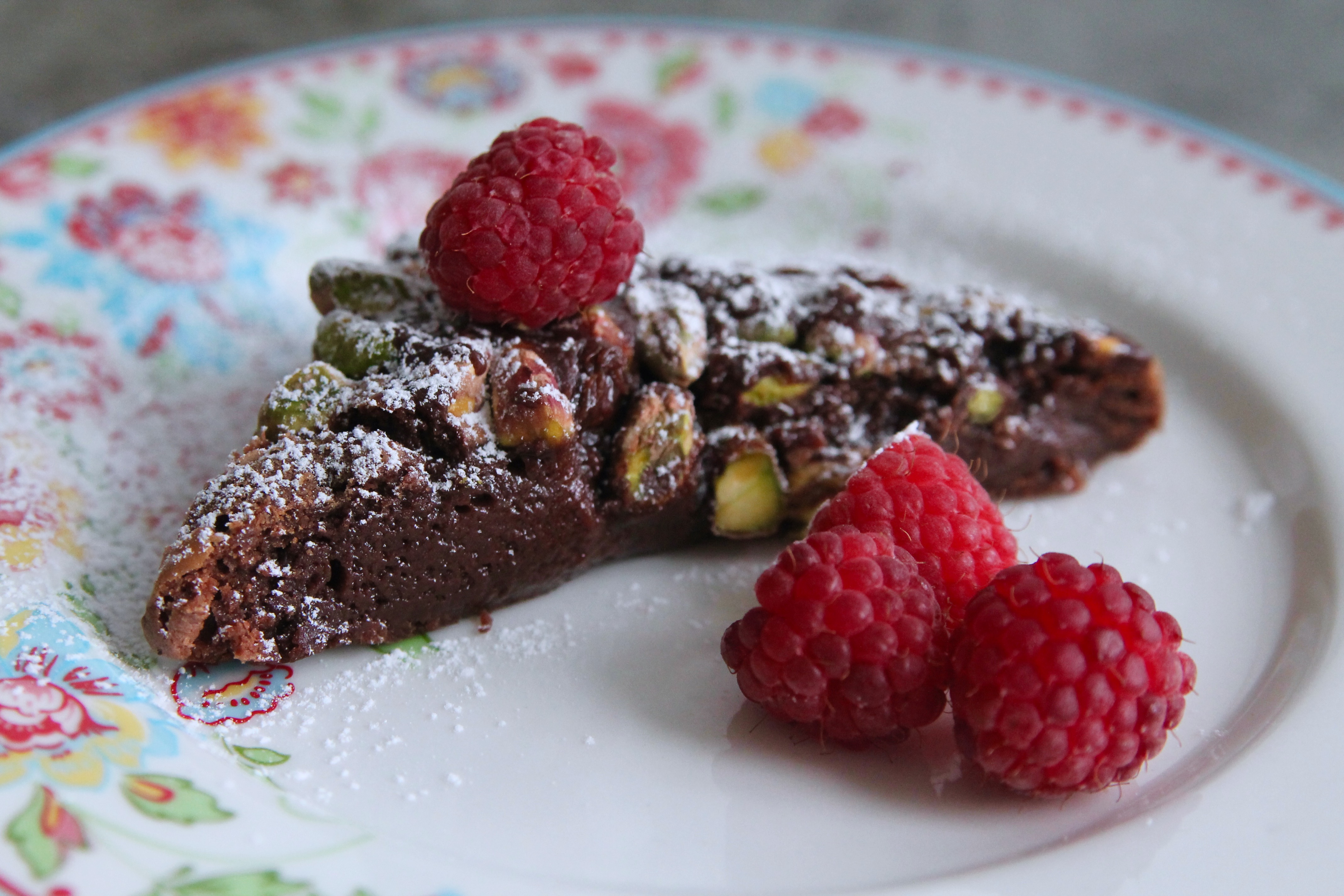 Och vänd ner mjölet. Häll upp i smord form eller bakpappersklädd ( gärna något mindre än 15*20 ) Strö över pistagenötter & flingsalt. Grädda den i mitten av ugnen i cirka 15-18 minuter. Ställ in i kylskåp i minst 4 timmar, ringla över lite ljummen nutella och servera.