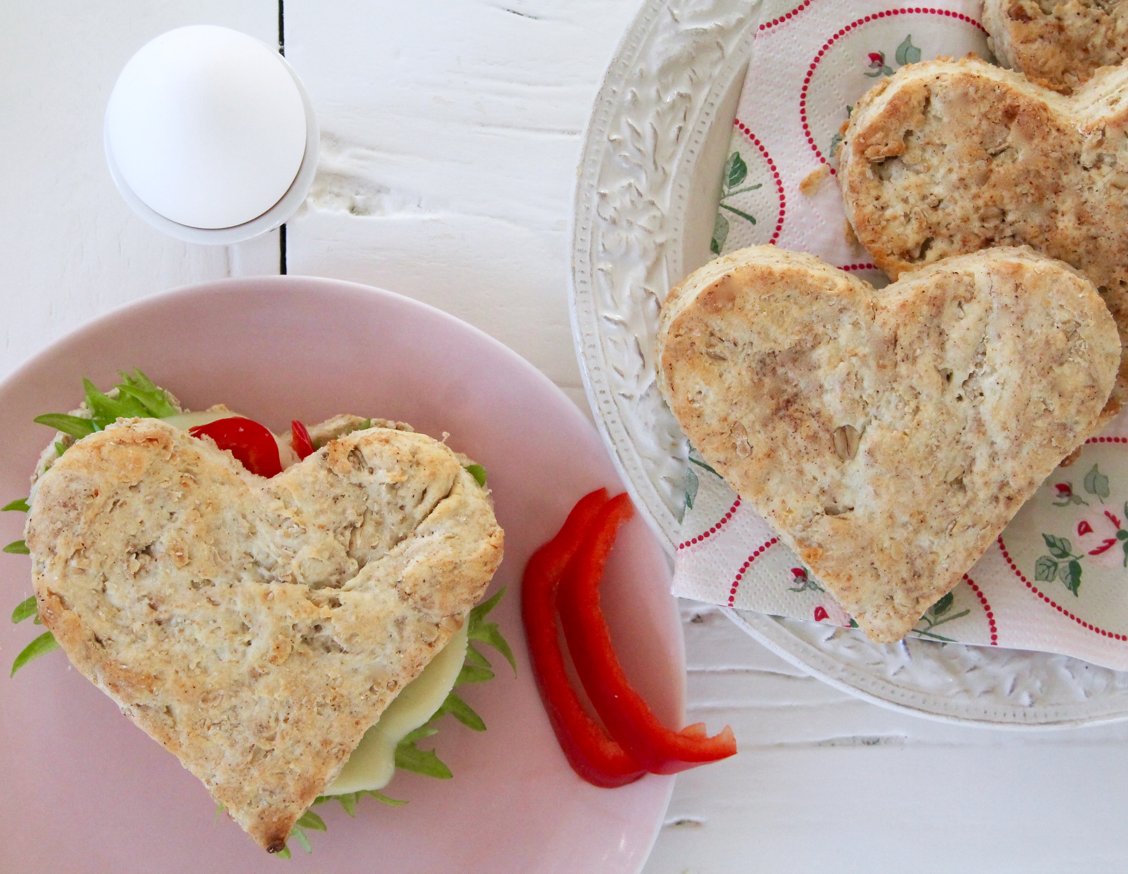 Ställ ugnen på 250 grader. Blanda först de torra ingredienserna i en skål , tärna ner smöret och arbeta ihop till en hyfsat grynig massa, blanda ner mjölken och arbeta till en deg . Dela degen i 8-9 högar och platta ut dem och kavla cirka 1- 1 1/2 cm tjock. Tryck ut 8-9 stora hjärtan och lägg på en bakplåtsklädd plåt. Grädda i mitten på ugnen i cirka 10 minuter, eller tills de fått en gyllene färg.