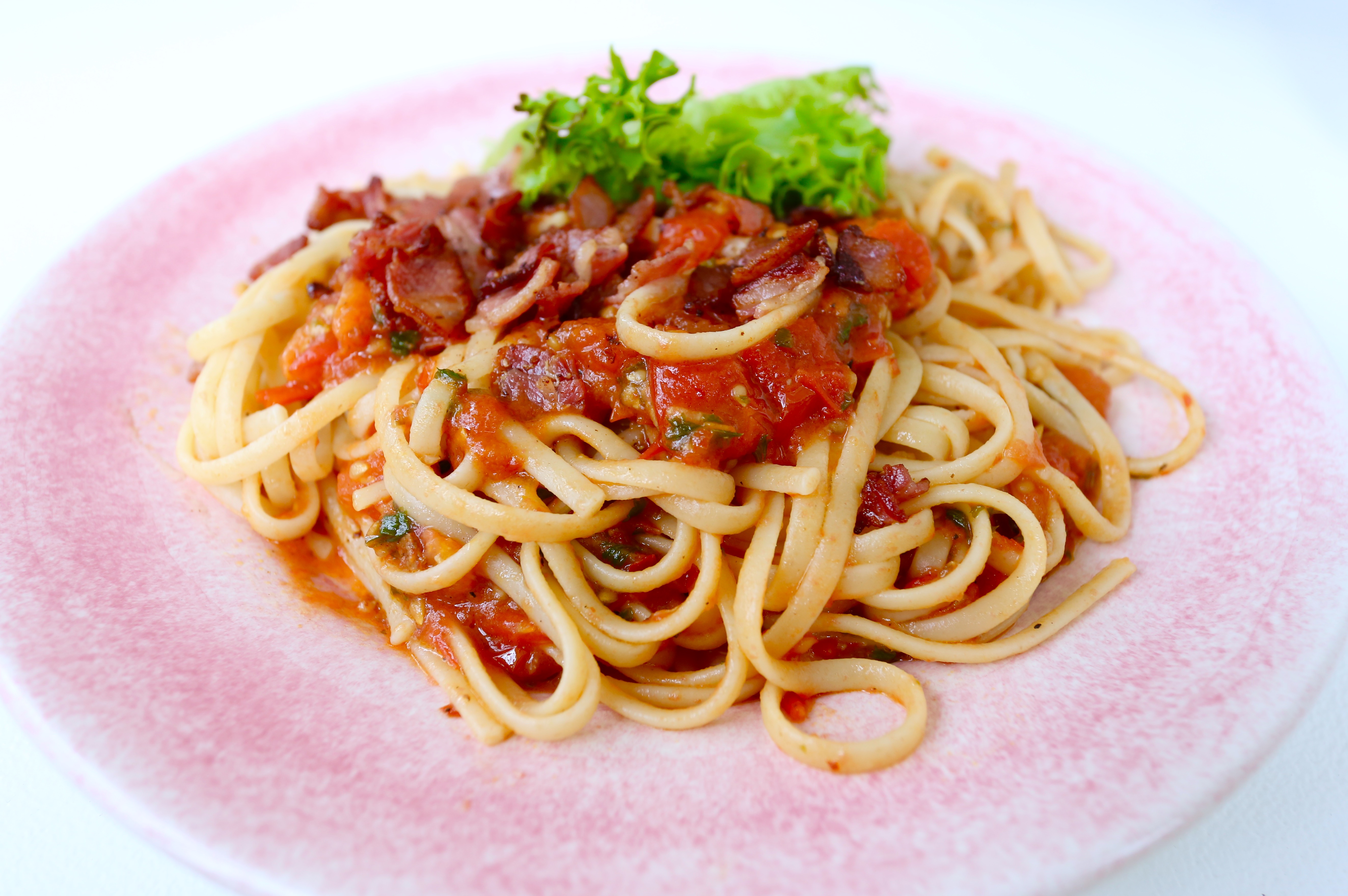 En härlig pastarätt med mustig tomatsås kokad från grunden toppad med knaperstekt bacon.