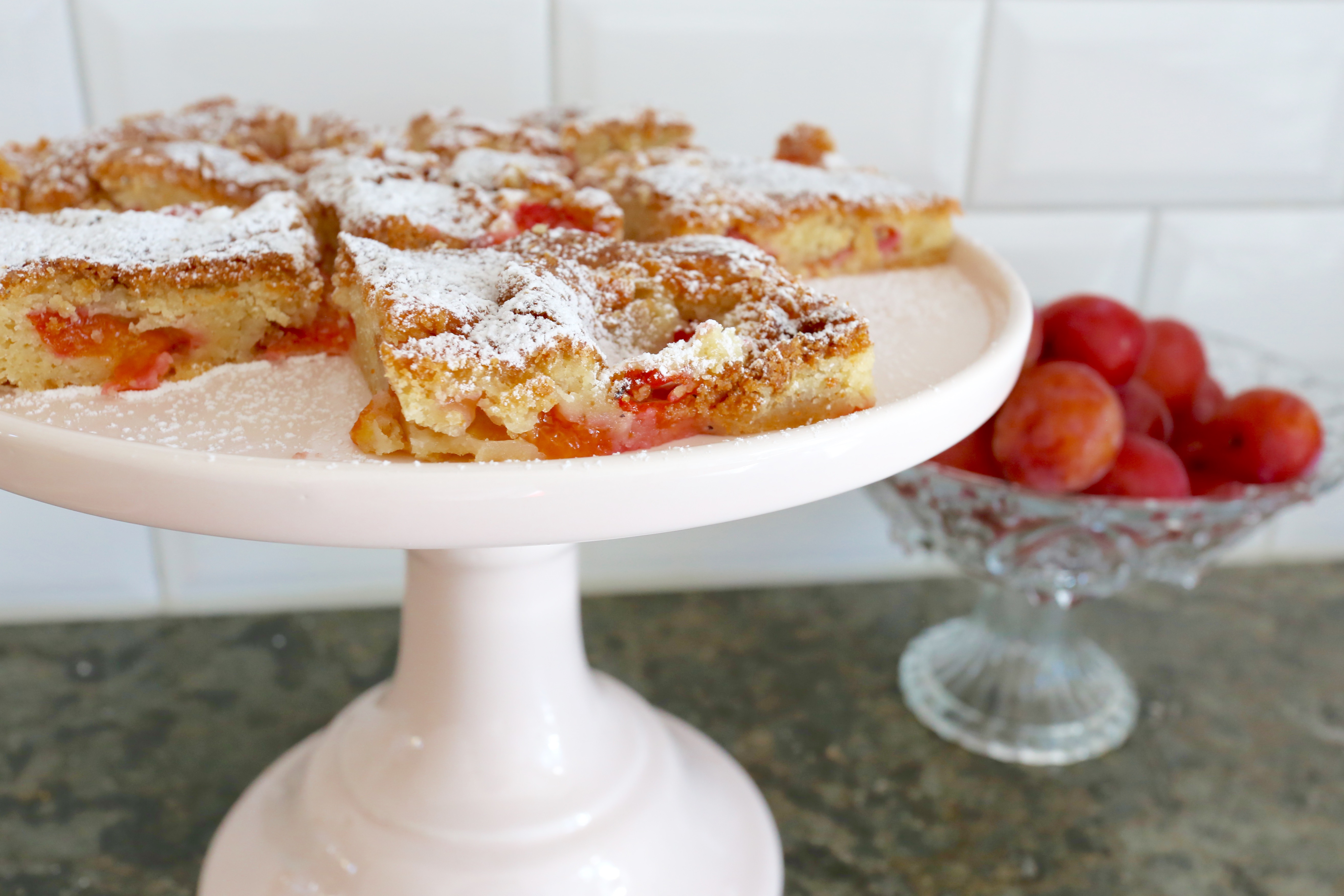 Skär plommonen i mindre delar och fördela dem jämnt över smeten. Grädda kakan i cirka 20 – 25 minuter i mitten på ugnen