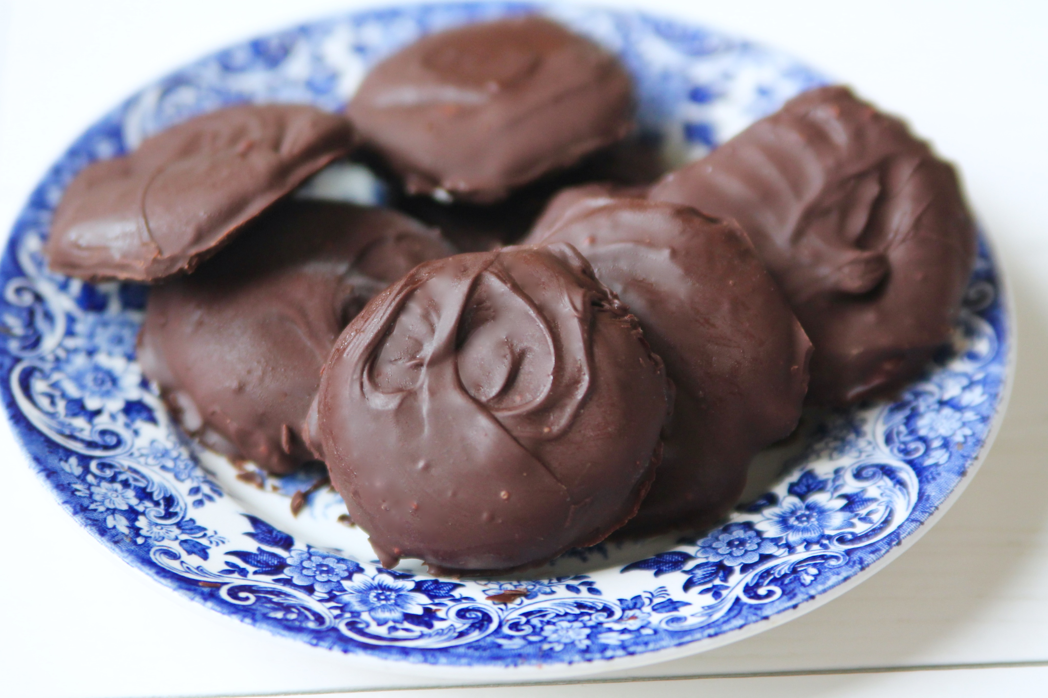 doppa dem i chokladen, låt överskottet rinna av, och lägg tillbaka dem på bakplåtspappret. Låt kakorna stelna i kylskåp innan du packar ner dem i en burk / kakburk.