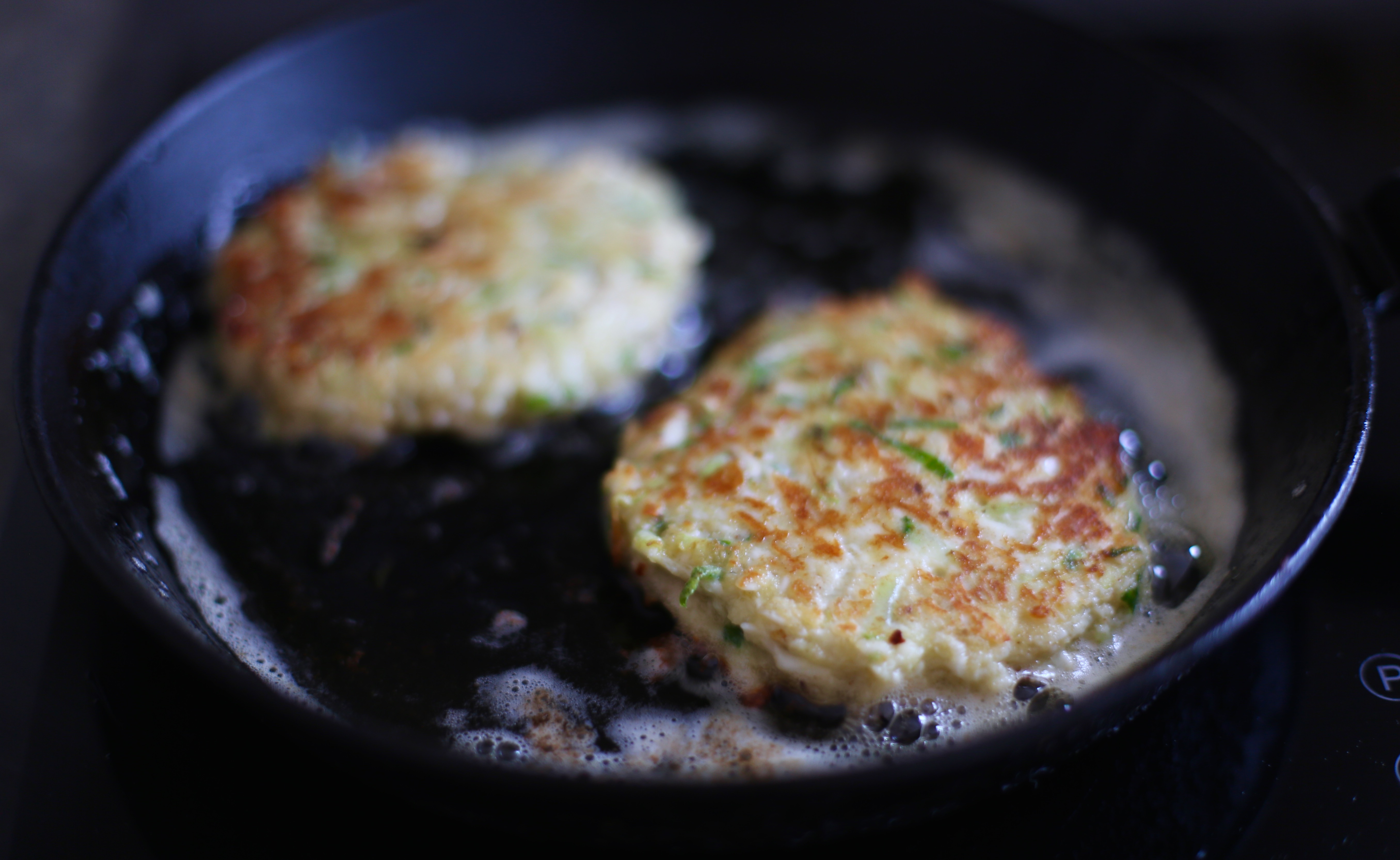 Jag brukar ta rivna morötter istället för zucchini. Blir jättegott! Sedan har jag dem i ugnen 250 grader på en plåt med bakplåtspapper.