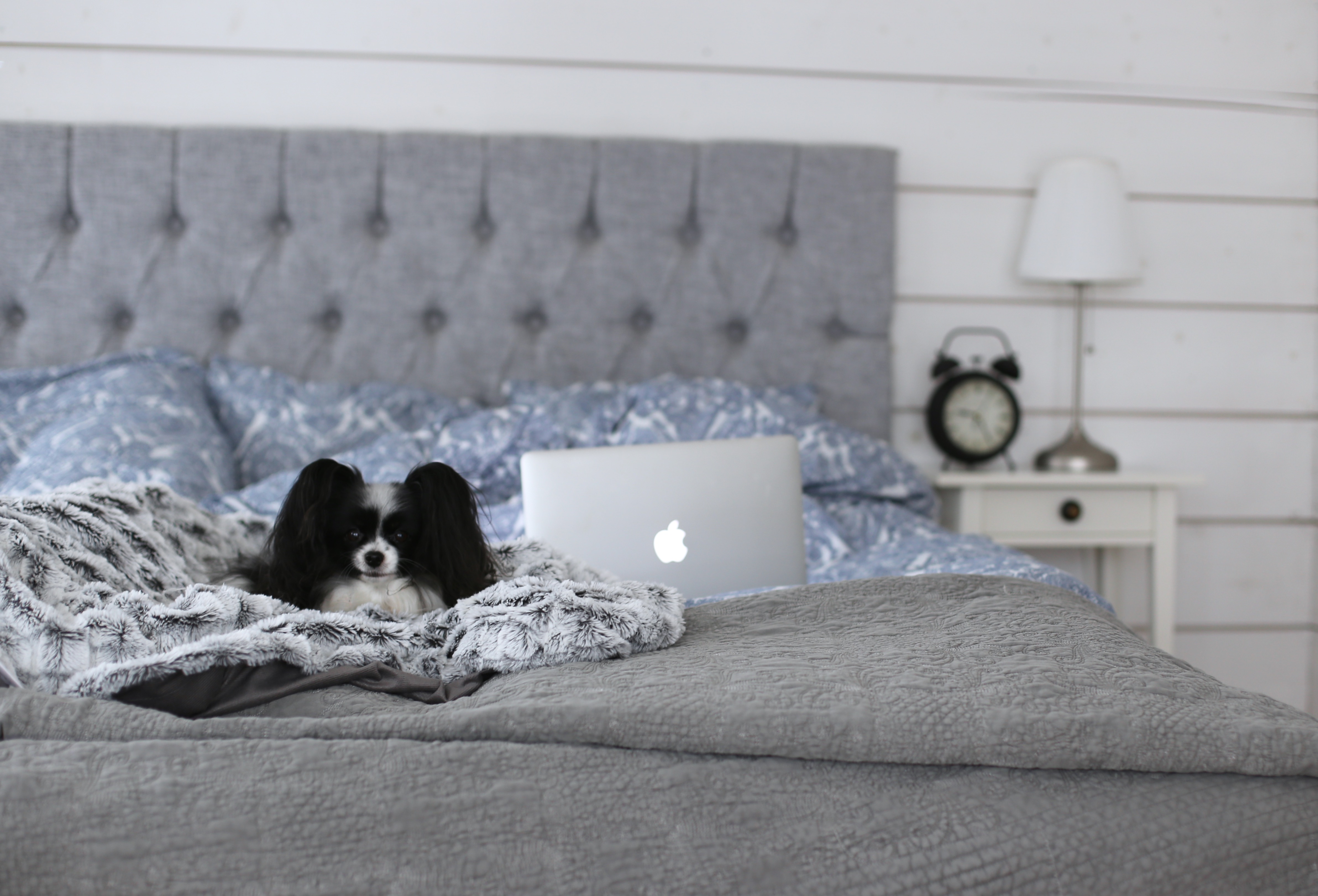 En morgontrött Molly gör mig sällskap. Hon vill alltid vara precis där jag är, speciellt när vi varit bortresta ett tag.