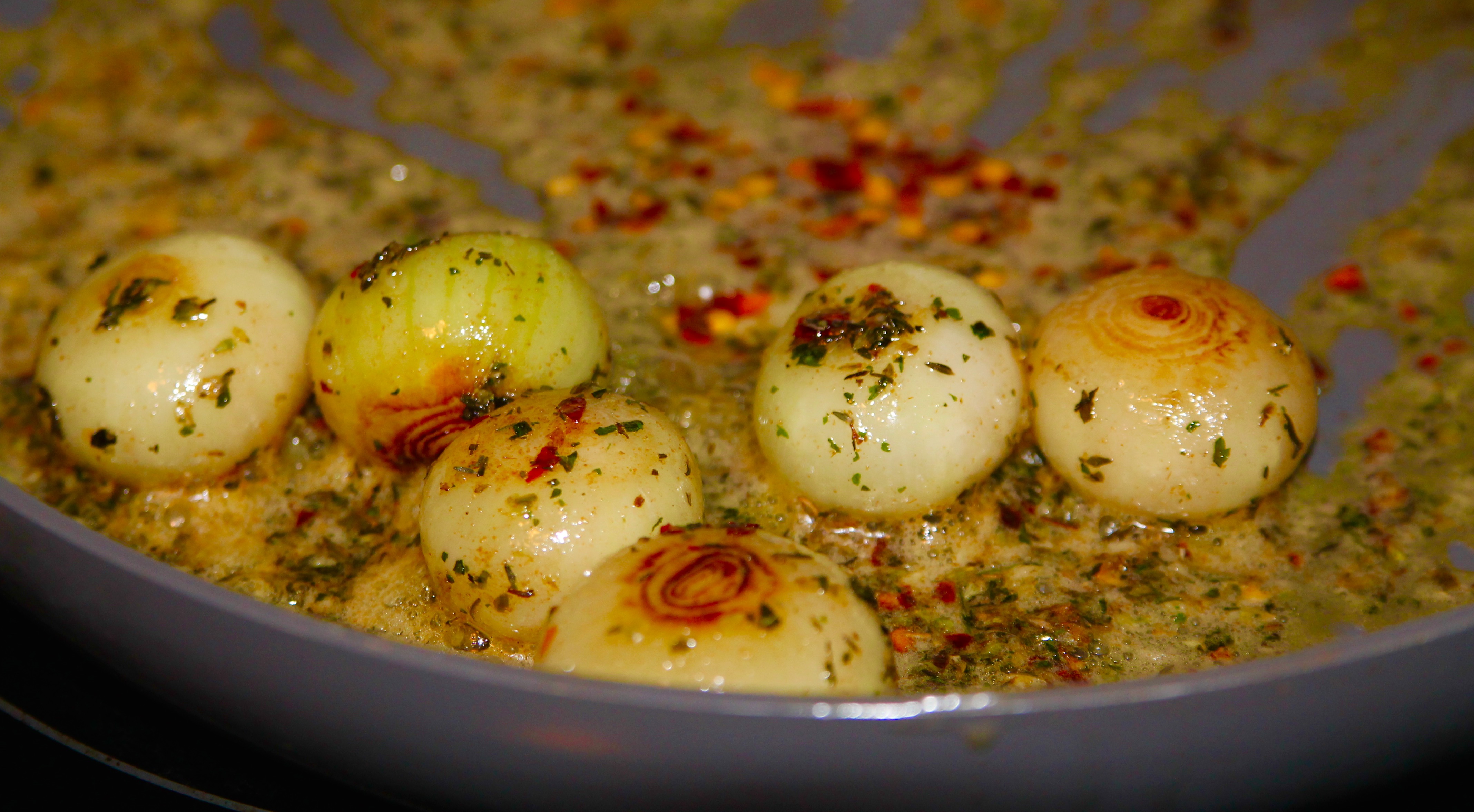 Hetta upp en stekpanna med höga kanter med smör. Skala och fräs löken på medelstark värme under omrörning. Pressa ner vitlöken i en liten skål och rör ner alla kryddor, rör om och vänd ner i stekpanna och fräs under omrörning tills alla kryddor doftar nötigt. Vänd då ner tomatkross, fond, rödvinsvinäger, socker och låt sjuda upp. Under tiden skär du filen i lagom stora bitar och slantar upp korven. Fräs detta i en annan stekpanna tills de får färg, och vänd ner i såsen tillsammans med en burk körsbärstomater.