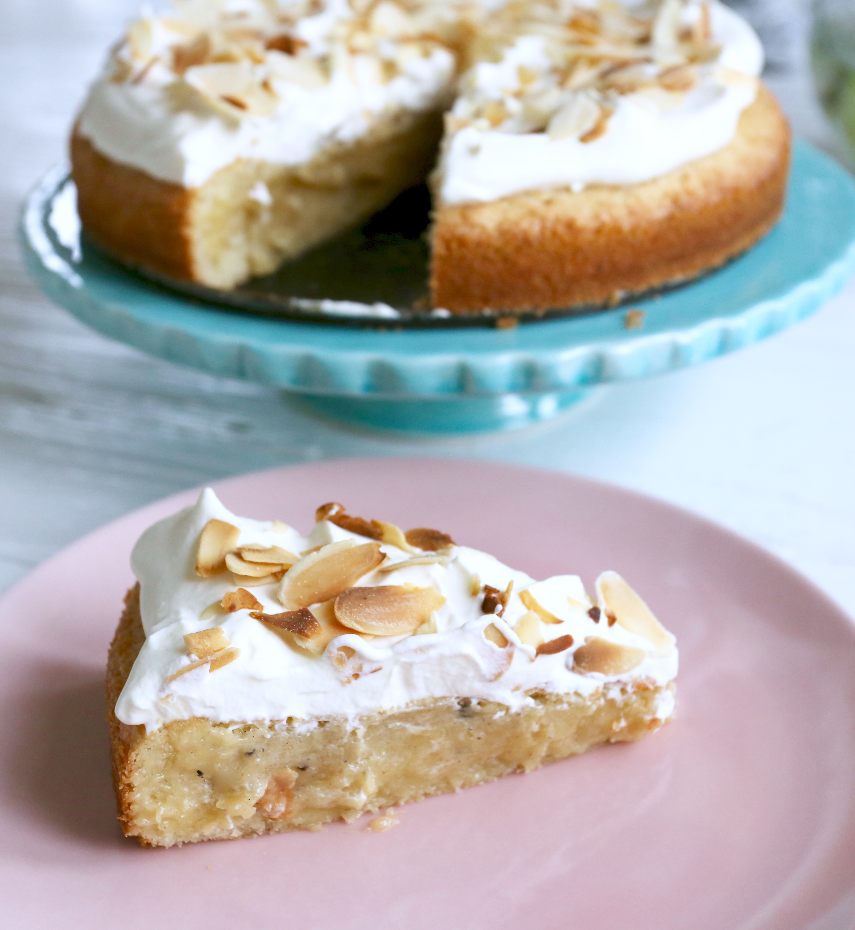 Rosta mandeln i en torr stekpanna så att den får nötig färg. Låt svalna under tiden du vispa grädden och bred över kakan, pudra över florsocker & på med den kalla mandeln