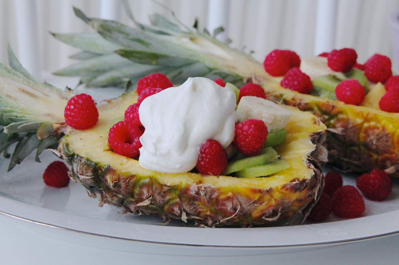 Skär den mogna ananasen mitt itu, Och skär försiktigt ut det mesta av fruktköttet + ananasen. Skala och skiva frukten och dela den i lagom stora bitar, blanda allt & fyll den i ”ananasskålen”. Vispa grädden lätt och smaka av med lite vaniljsocker.
