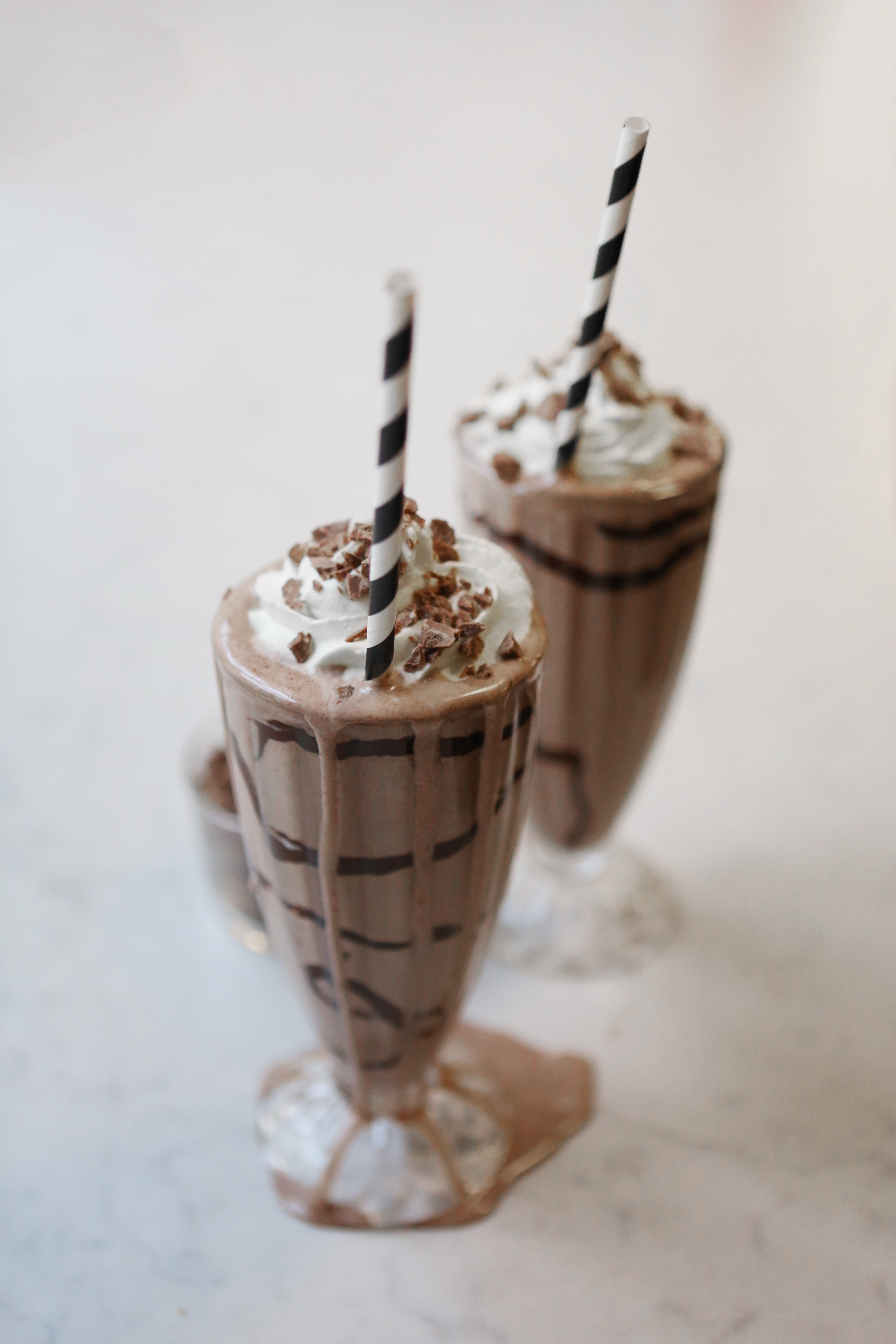Eller om du inte har mixer går det lika bra att vispa med elvisp. Önskar du en lösare konsistens tillsätt mer mjölk, eller tjockare, tillsätt lite mer glass. Skvätt lite chokladsås på insidan av glaset innan du häller upp din milkshake. Toppa med grädde, chokladsås, strössel, choklad & körsbär