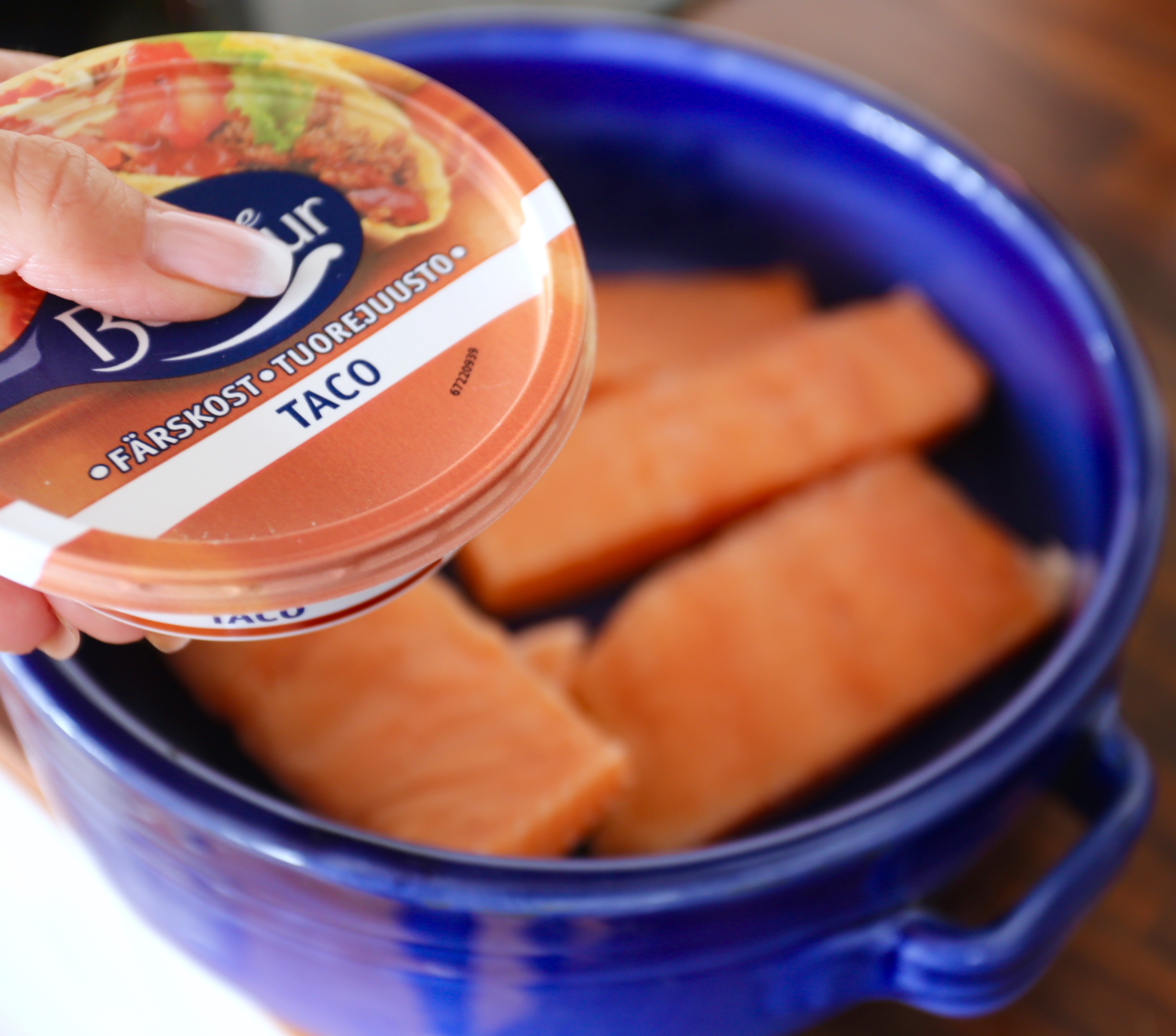 Jag hade lax i frysen, så jag tänkte att det fick duga bra. I kylen hittade jag lite färskost med smak av tacos.