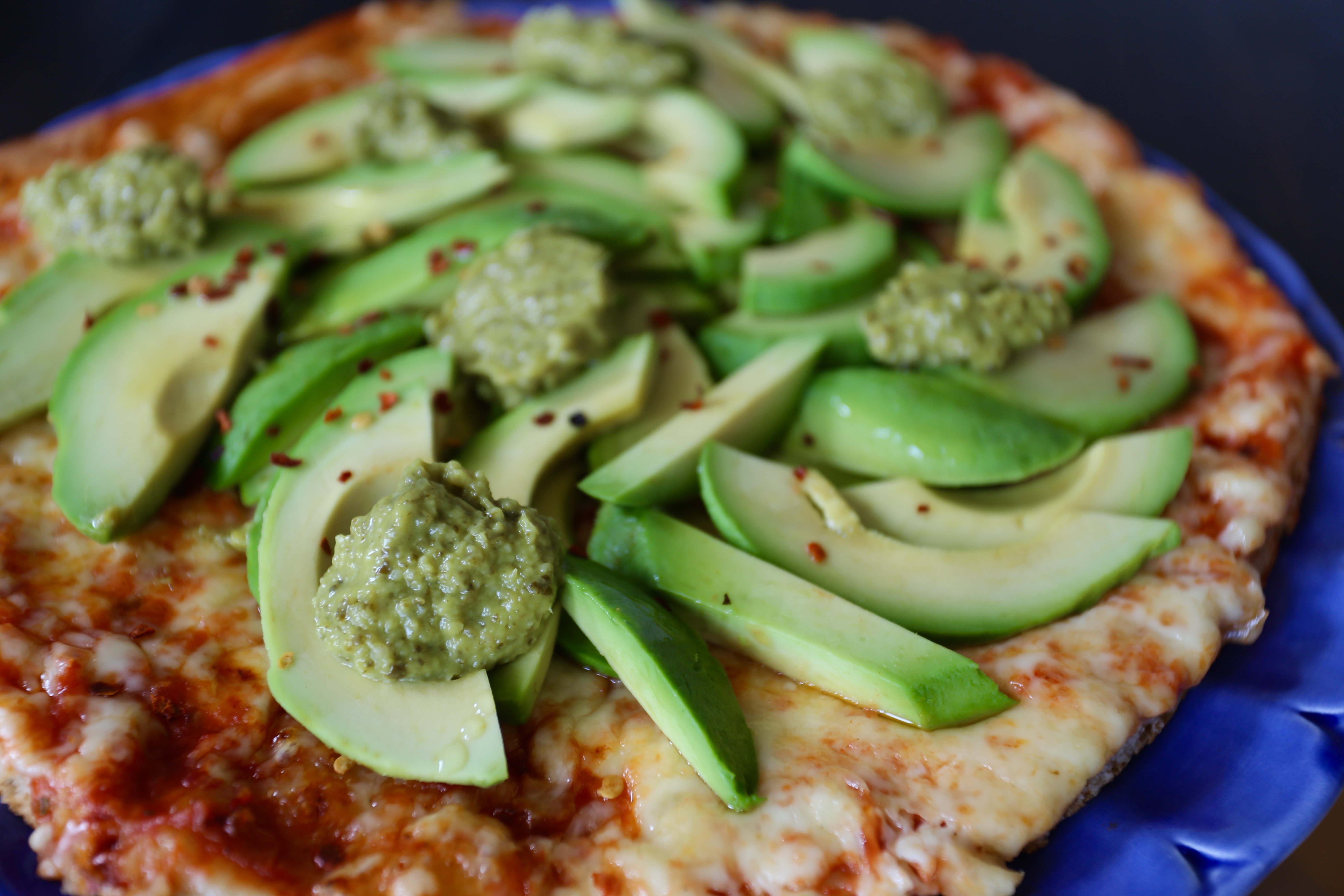 In i ugnen och gratinera 15-20 minuter eller tills osten börjat bubbla. Ta ut pizzan, skiva upp avokadon och fördela ut den i något tjusigt mönster. Klicka ut pesto, dra ett par varv med chili explosion.