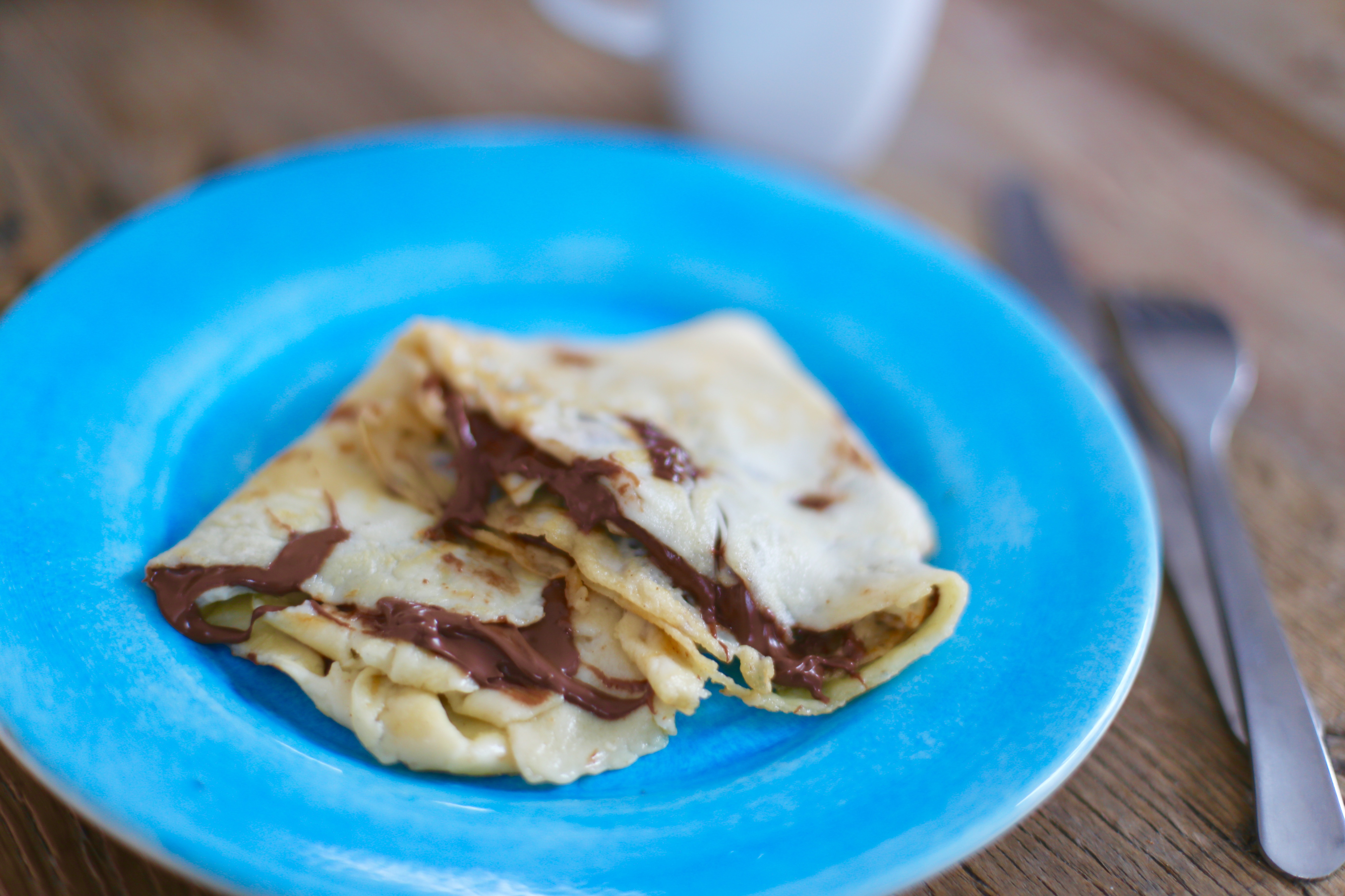 Jag har inget smör i smeten, det har jag sedan i stekpannan när jag gräddar. Låt crêpesen svalna något innan du fördelar nutella över halva. Vik ihop på mitten, och en gång till över mitten.
