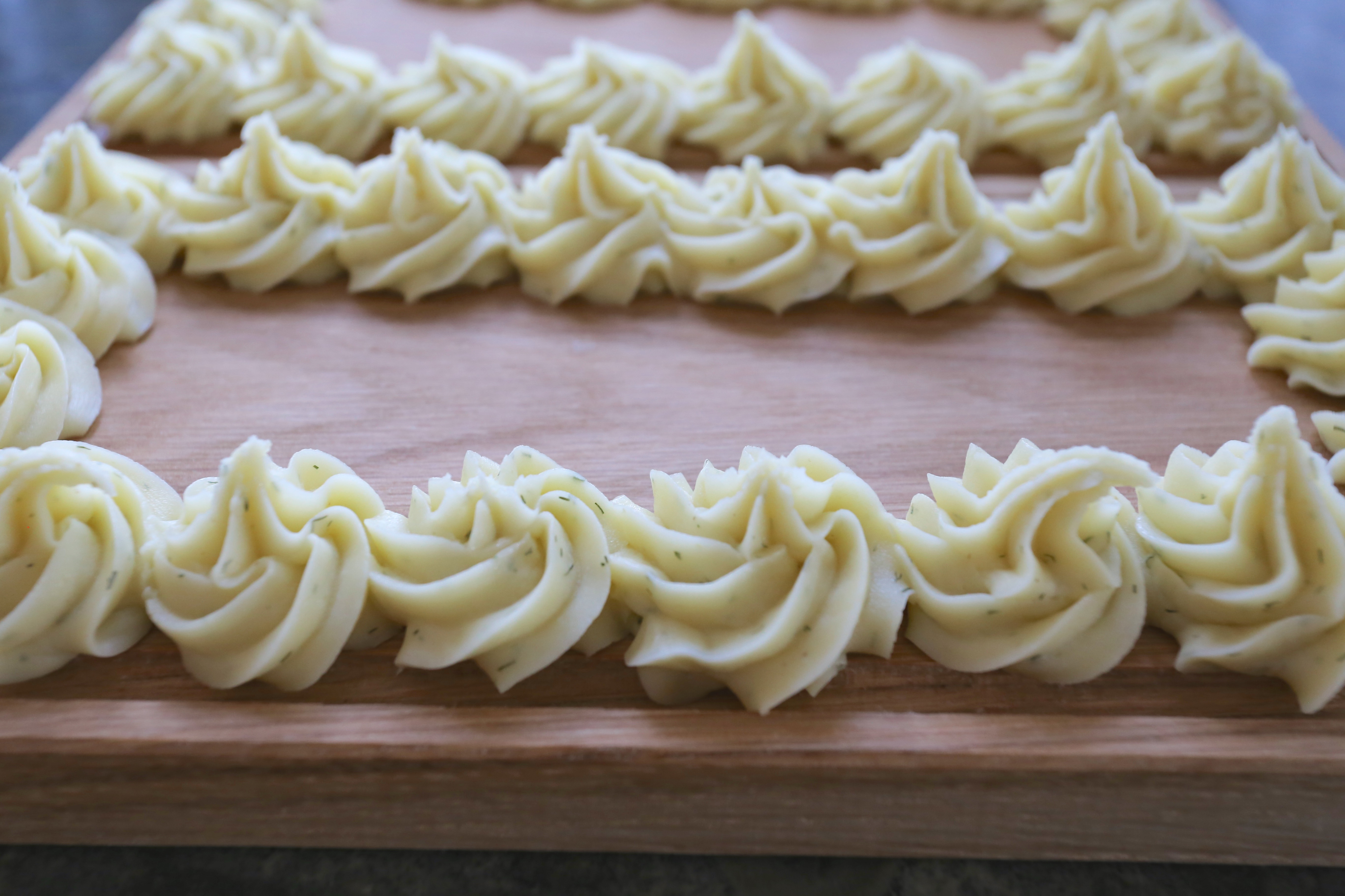 Koka potatisen mjuk, och gör mos av den med potatiskross & blandar ner äggulor & grädde. Smaka av med salt & peppar + dill. Lägg in plankorna i ugnen för att bränna av dem, i cirka 5 minuter. Olja in plankorna och lägg laxen där och skjuts in i ugnen, låt ligga i 15 minuter, eller tills laxen börjar bli klar & få vacker färg. Ta ut och höj värmen till 250 grader spritsa sedan / eller klicka ut ”duschesspotisen” över plankorna. Jag brukar låta moset svalna innan, för att lättare spritsa det sen. Fördela ut klyftade körsbärstomater och skjuts in i ugnen.