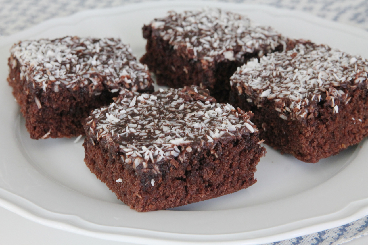 Smält smöret och ställ åt sidan. Vispa ägg och socker så att det blir vitt & luftigt, blanda resten av de torra ingredienserna till kakan och sikta ner i smeten. Tillsätt smör & mjölk under omrörning och rör till en jämn smet. Häll smeten i långpanna och grädda i 20 – 25 minuter. Under tiden gör du glasyren.