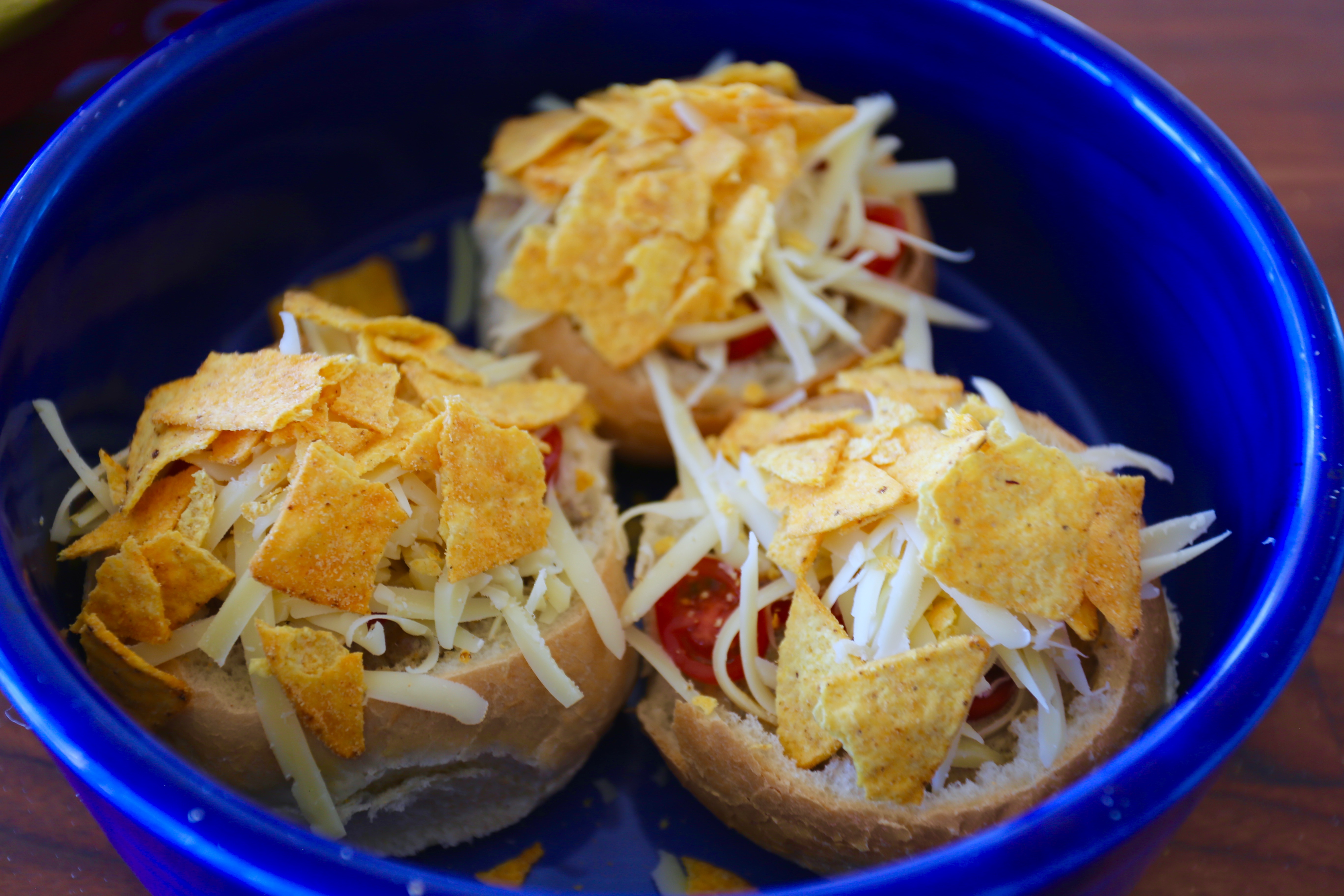 Ställ ugnen på 200 grader. Skär av toppen på frallan och gröp ur det mjukaste av brödet. Placera alla frallor i en ugnssäker form.  Värm upp en kastrull med färsen tillsammans med crème fraiche & ketchup. Fyll upp bröden med färsen. Skiva körsbärstomater och lägg på, riv över ost och krossa lite tacochips.