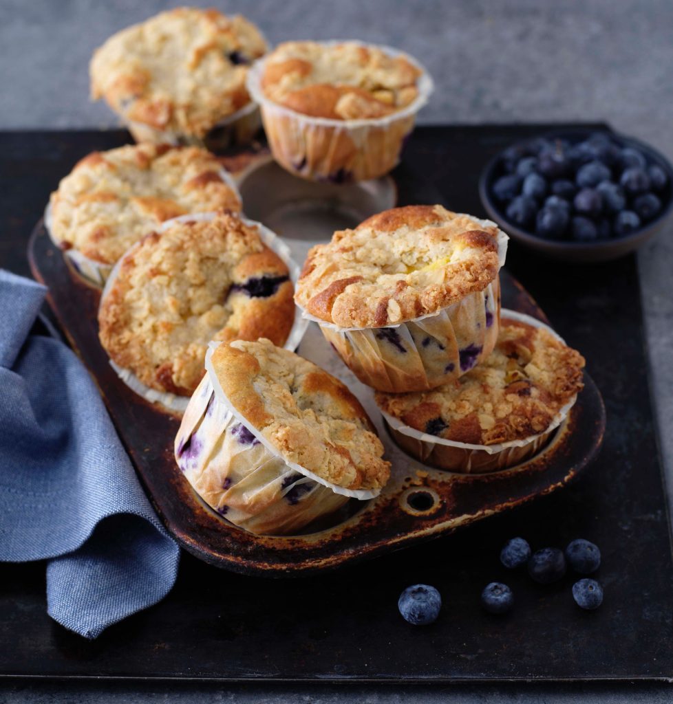 Vänd sedan ner mjölkblandningen, blanda de torra ingredienserna i en skål och vänd ner i smeten. Fyll upp formarna ungefär 3/4 med smeten. Fyll upp en sprits med vaniljkrämen och spritsa ner en msk eller två av den goda vaniljkrämen ner i smeten. Strö över blåbär och toppa med så mycket crunch som du bara får plats med.